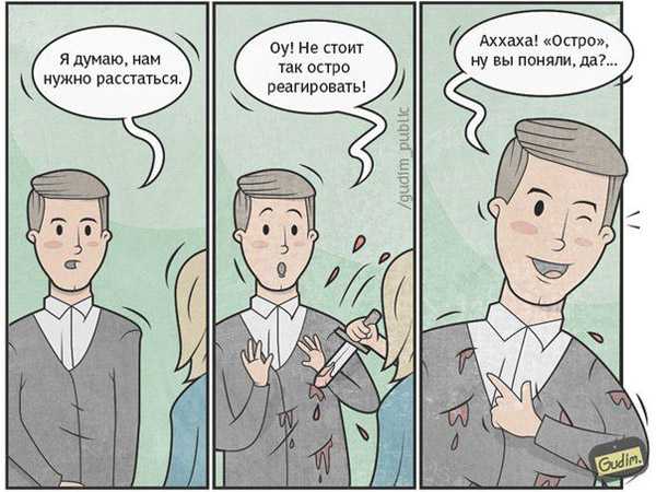 Следующим юмористическим приемом будет игра слов и каламбуры. Это тоже довольно простой и незатейливый жанр. В книге Юрия Карабчиевского «Воскресение Маяковского» хорошо описан процесс придумывания таких шуток: «Нет более скучных и унылых людей, нежели упорные каламбуристы. Вот ты разговариваешь с ним, разговариваешь и вдруг замечаешь по особому блеску глаз, что он тебя совершенно не слышит, что он слушает не тебя, а слова, да и то не все, а одну только фразу. Он случайно выхватил ее из текста и теперь выкручивает ей руки и ноги, тасует суффиксы и приставки, выворачивает наизнанку корни. Лихорадочная механическая работа совершается в его усталом мозгу. И когда, наконец, каламбур готов, он выпаливает его как последнюю новость, огорашивая тебя в середине слова, и приходится вымучивать вежливую улыбку, тихо сожалея о смысле недосказанного. А твой собеседник уже вновь наготове, нацелил уши, навострил когти, ни минуты простоя и отдыха»