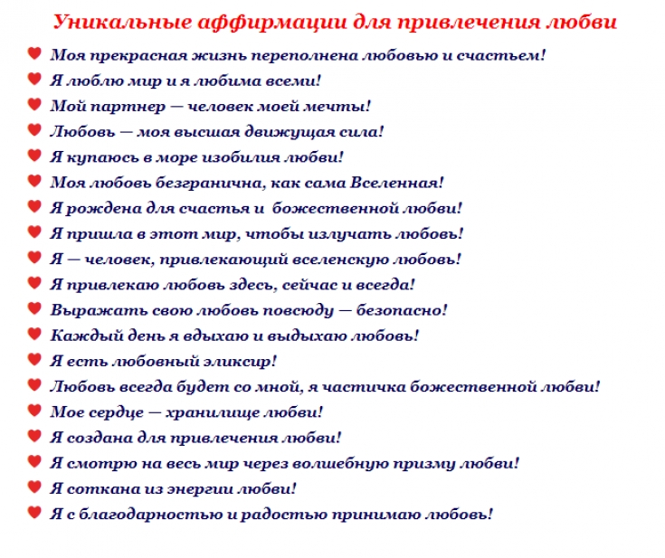 Выберите 2-3 аффирмации, повторяйте их 7 дней подряд, затем поменяйте на новые. И помните: вы достойны любви по праву вашего рождения. У вас все получится!