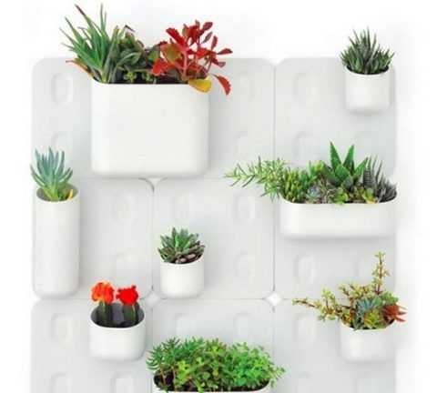- Мини клумба, которая украсит каждую стену маминого дома. Да, это небольшое панно, где размещены легкие цветы в горшках. Их не стоит поливать, цветы можно менять время от времени. Чаши крепятся на саморезы, и при желании папа может помочь в оформлении такого подарка.