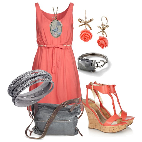 - Серым. Коралл и холодный серый оттенок в одежде – элегантное сочетание, уместно и для деловых встреч, и для торжественных выходов.