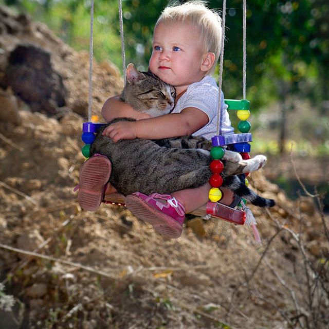 Позитивная картинка – Девчушка катается на качелях из листьев.