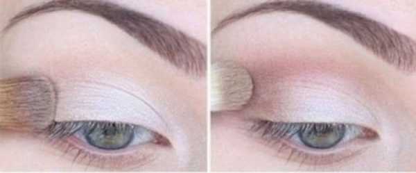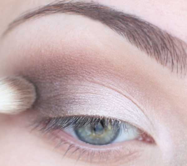 - Тенями светлых тонов покрываем всю область века. Подвижную часть подкрашиваем пигментом в светло-розовые оттенки.
