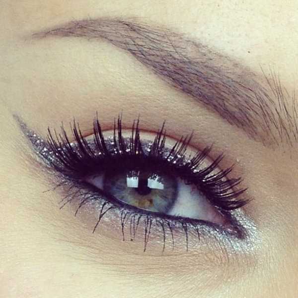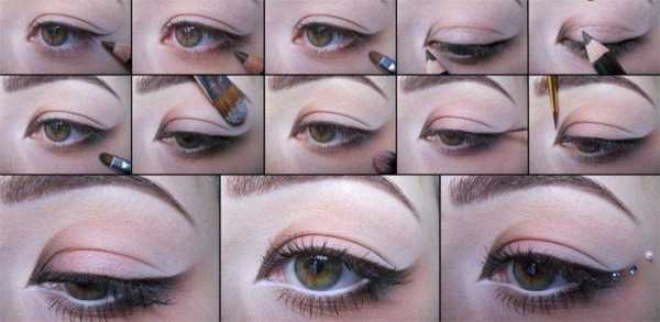 Шаг 3: прорисовка стрелок. Подводку для макияжа используем чёрную или тёмно-коричневую, серая в таком мейкапе потеряется. С её помощью рисуем классические стрелки от внутреннего уголка глаза ко внешнему, постепенно увеличивая ширину, и заканчиваем длинным эстетичным хвостиком, загнутым вверх.