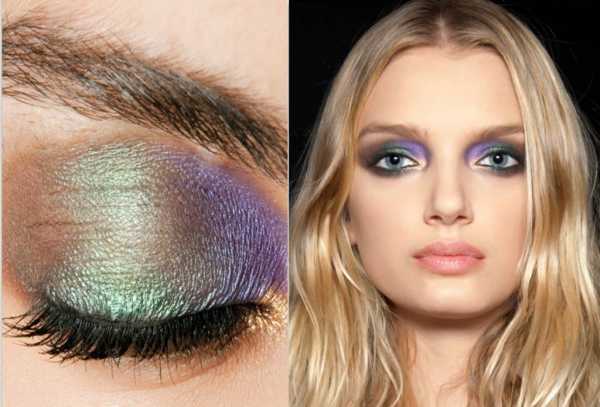 Блондинкам тоже очень идут более яркие весенние тона. Если добавить немного зелёного, тогда зрачки тоже будут зеленее. Такие варианты будут красиво выглядеть на выпускном балу. Лиловые стрелки подчеркнут красивую голубизну зрачков блондинки.