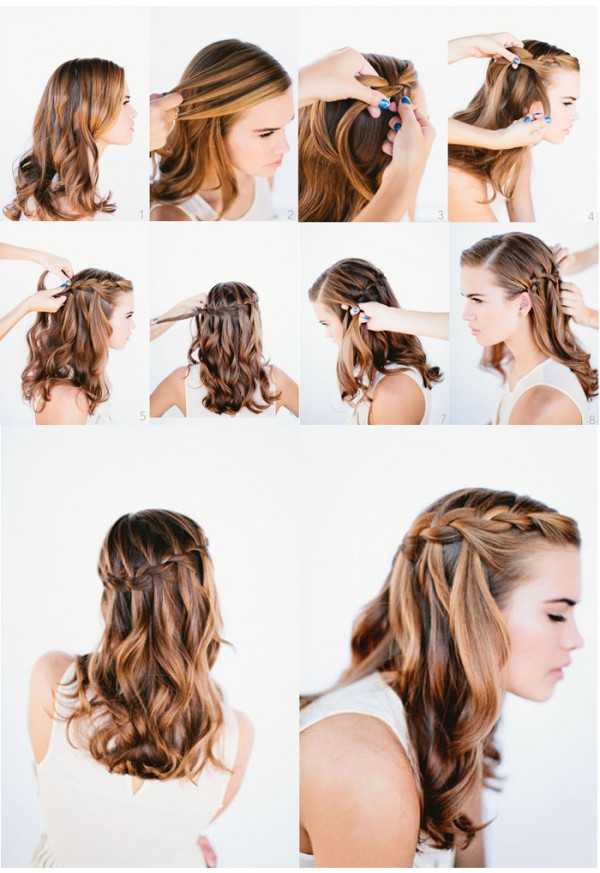 - Первую прядь делим на три и плетём французскую косу по всей окружности головы. При захвате верхней пряди в каждом элементе плетения пропускаем ее вниз и оставляем свободной: это «струйка водопада», затем берем следующую прядь под косой и так далее.