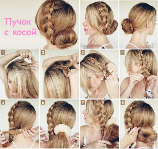 - Осталось свободной частью косы обернуть пучок вокруг и зафиксировать шпильками или невидимками.