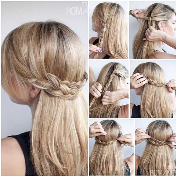 На средней высоте отделяем небольшие пряди по обе стороны лица и плетем две простые косы или «колоски». Остальные волосы распущены. Затем первую косу протягиваем слева направо, вторую — справа налево, кончик каждой косы прячем под основание противоположной косы и закрепляем шпильками. Получаем красивое обрамление для причёски.