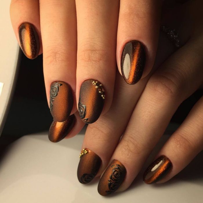 Не обойдется этой осенью и без коричневых оттенков на ноготках. Институт цвета пророчит популярность темному коричневому под названием «Каменистая дорога» и рыжеватому оттенку «Сахарный миндаль». Эти цвета красиво сочетаются с золотым декором и блестками, передают всю глубину и многообразие оттенков красочной осени.