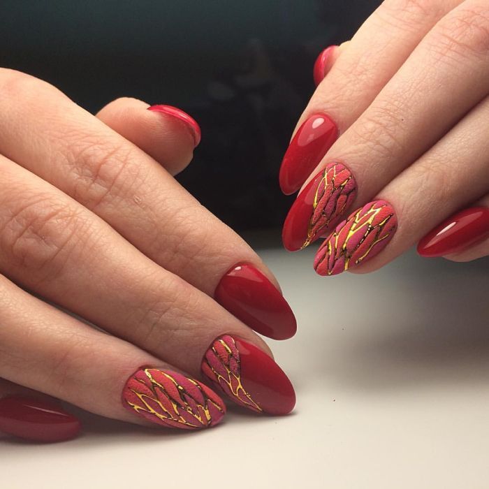 Если хотите сделать классический маникюр и при этом добиться того, чтобы ногти были яркими, то воспользуйтесь тенденцией использовать лаковые гели с различной текстурой и оттенками красного.
