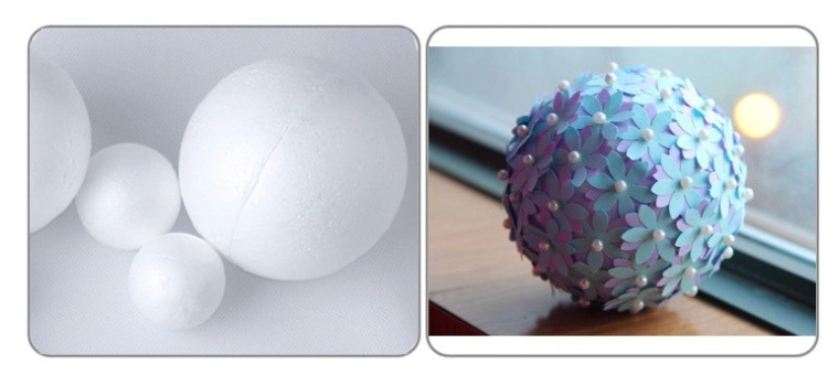 - Вырезание. Нужно найти подходящий по толщине кусок пенопласта, например, упаковочный пенопласт для бытовой техники. Затем вырезать из него сферу, укрепить верхний слой грунтовкой, нанести клей и декорировать любыми украшениями.