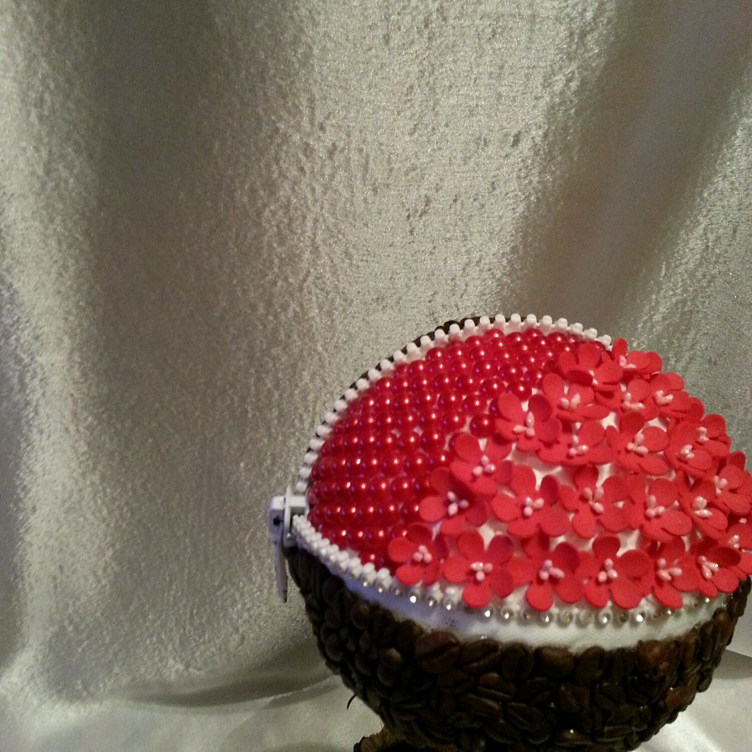 Украшения легко снимаются, если перед декорированием наложить на топиарий обычную пищевую пленку. Пленка плотно фиксируется у основания шара, а украшения приклеиваются к ней. Когда нужно произвести замену, украшения отделяются от основы вместе с пленкой. Своими руками можно переделать сферический топиарий в любой другой, если снять украшения и добавить объем к основе. Из шара можно сформировать сердечко, тетраэдр или овал.