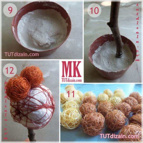 3. Шар из сизаля. Очень красивые европейские деревья можно сделать, используя как основу – сизаль. Скомкайте пару газет, как в предыдущих способах, обтяните нитками. Затем подберите сизаль нужного цвета. Купить сизаль Вы сможете в нашем магазине в разделе «Сизаль».