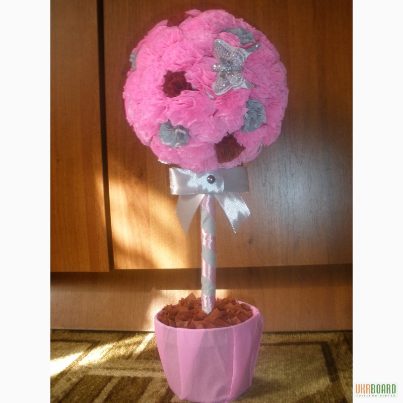 Подарок к любому празднику, оригинально украшенный топиарий, можно сделать своими руками. Дерево счастья обычно имеет круглую крону, на которую наносятся декоративные элементы: конфеты, кофейные зерна, цветы, ленты, блестки и стразы.Содержание материала: