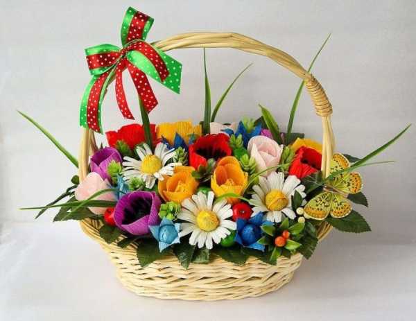 Дополнительно букет можно украсить бусинами и бантами из атласных лент. Цветы из конфет можно поместить в корзинку.