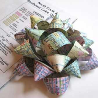 - Бант. Оригинальным бантом можно украсить подарочный пакет, кулек или коробку. Вариантов изготовления бантов для упаковки очень много, в качестве материалов могут подойти красивая оберточная бумага, разноцветные ленты, кружева, тесьма и даже яркие страницы из журналов.