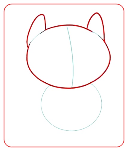 Сначала нарисуем голову кошечки. Посмотрите внимательно на следующую картинку и нарисуйте голову кошечки точно также, как изображено на картинке, теперь нарисуйте треугольные ушки, посмотрите внимательно, как расположено туловище и нарисуйте точно также.