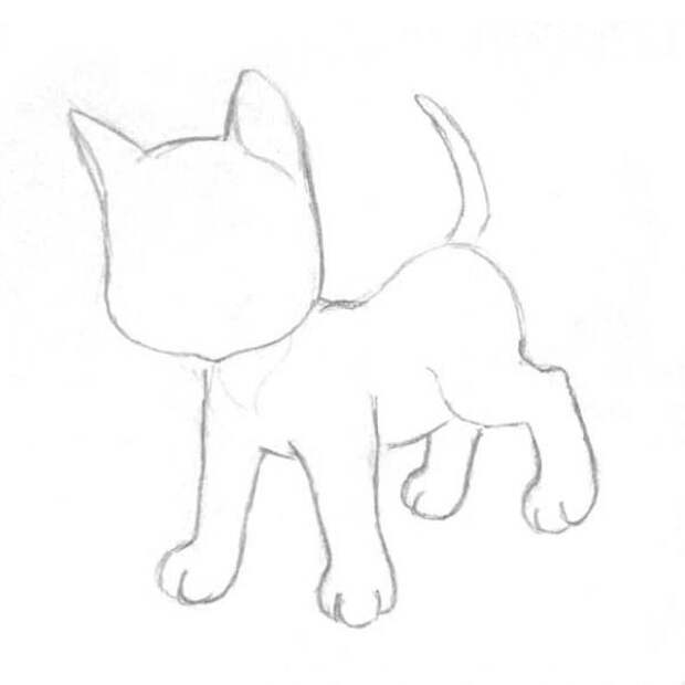 Чтобы вам не «запутаться» на этом шаге, нарисуйте вначале контуры лапок, а после и ушки. Это совсем несложно, и теперь вы видите, что осталось лишь нарисовать линию спины и можно сказать, что рисунок кота «проявился».3. Рисунок кота. Общий контур