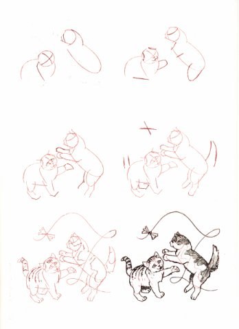Котенка сложнее рисовать, чем взрослую кошку, поскольку котенка невозможно заставить сидеть неподвижно, в течение даже минуты. Поэтому нарисованные картинки котят «с натуры» встречаются довольно редко. Единственный способ рисовать котенка, да и кота тоже, только спящим.