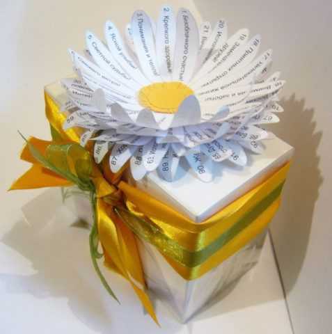 - Два или три банта из лент контрастных цветов, крест-накрест обернувших коробку.