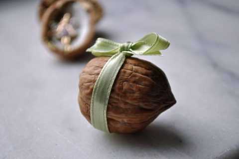 - В виде ожерелья с сюрпризом. Понадобятся грецкие орехи, нить с иголкой, клей и акриловые краски. У расколотых орехов вынуть из одной части серединку и вложить туда свернутую купюру. Орех склеить. Готовые орехи покрасить ярким цветом и нанизать на нить, чтобы сделать это было проще, просверлите предварительно дырочки.