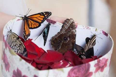 - Тропические бабочки. Такое поздравление, безусловно, приведет в восторг прекрасный пол. Курьер просит открыть коробку — и жилище именинника преображается в волшебный зал.