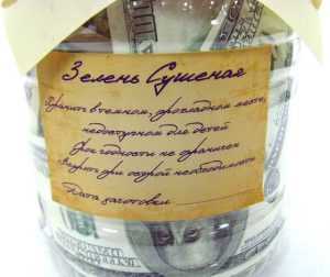 Банка с широким горлышком, тогда содержимое из нее извлекать будет проще. Вместо крышки подойдет кусочек бархатной или мелованной бумаги, которую завязывают яркой ниткой или лентой. Чтобы банка выглядела еще прикольнее, добавьте этикетку с надписью, например, «Цветная капуста» или «Зеленый банк» и инструкцию, как хранить такой ценный «продукт».- Обычный фотоальбом, а оригинальное оформление ему придаст распечатанная на принтере обложка сберегательной книжки. Ее либо приклеивают сверху, либо просто вставляют на первой странице окошка. Чтобы заполнить альбом полностью, на пустых страницах размещайте фото именинника или открытки со словами пожелания.