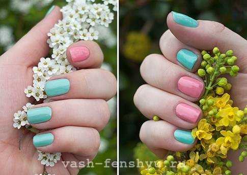 Фен-шуй позволяет окрашивать все ногти в разные цвета или 4 одним тоном, а оставшийся – иным.