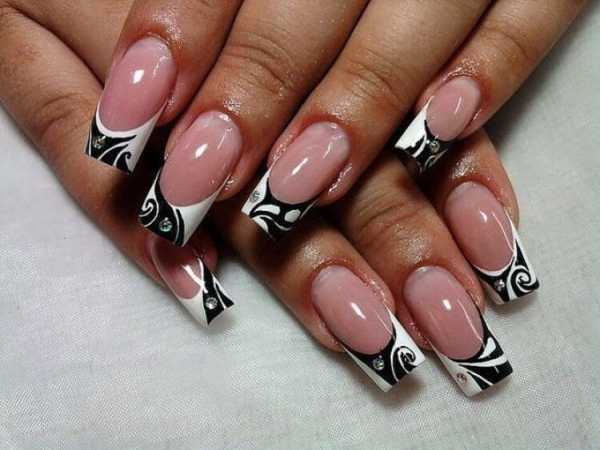 Беспроигрышный френч также можно сочетать с традициями восточной философии. В дизайне на фото обыграна символика инь и янь в черно-белом цвете. Задача такого маникюра – гармонизация мужского и женского начал в образе, баланс стихий и пропорций, а также добавление блеска в стразах, привлекающего стихии огня и металла.