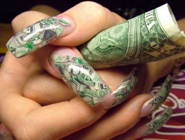 Если нужно привлечь в жизнь богатство, то маникюр поможет и в этом. Для дизайна использовался эффект битое стекло. Купюра режется на мелкие кусочки, а затем клеится на основу, покрывается топом к гель-лаку и полимеризуется. Эффектно, не правда ли?