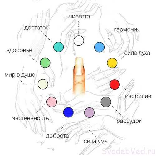 Специалисты в области фен-шуй уверены, что больше внимания следует уделять «отдающей» правой руке. Каждый палец несет особый смысл, поэтому будет правильно раскрашивать их в разные цвета.