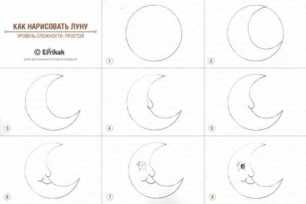 Все шаги для рисования луны в одной картинке. Можете распечатать данную пошаговую инструкцию и рисовать луну со своим ребенком в своё удовольствие. Теперь вы знаете как это сделать всего за несколько минут. Приступайте прямо сейчас!