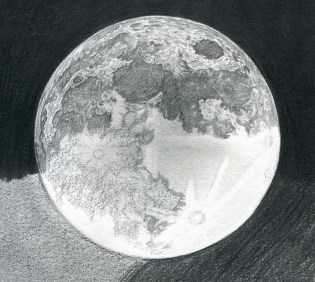 Для придания рисунку окончательного вида, остаётся усилить линию рельефа Луны карандашом, навести её очертания, и ластиком слегка вытереть отдельные зоны, создав впечатление лучей. рисунок