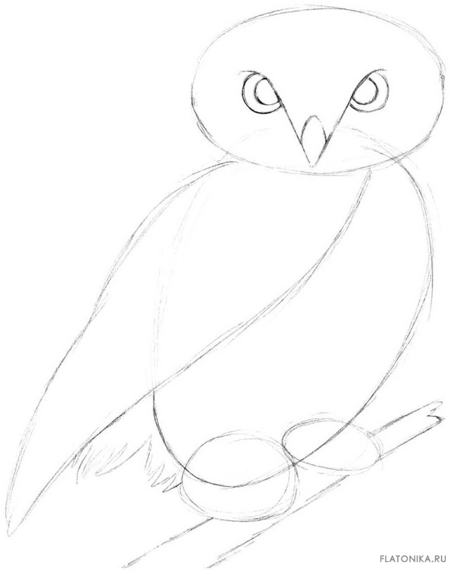 - Прорисовываем более детально глаза птицы, нарисовав окружности. Добавим изогнутые линии на клюве. Прорисуем дополнительно контур «лица» совы. Более детально прорисуем крылья и лапы. Несколькими линиями покажем мягкое оперение на грудке и животике птицы. Нарисуем ветку, на которой сова расположилась.