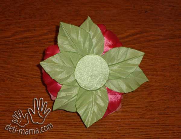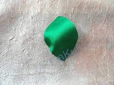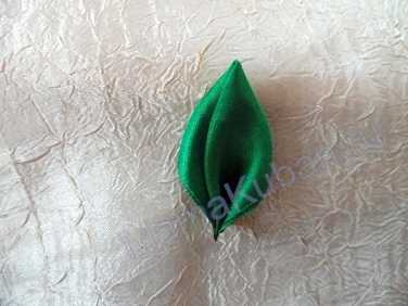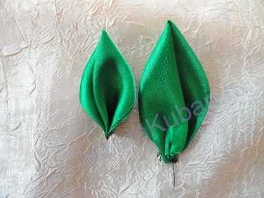 При изготовлении цветов из ткани и атласных лент не малую роль играют зеленые листочки. Они помогают оживить всю композицию, придать законченный вид, придать аккуратный вид изнаночной стороне.