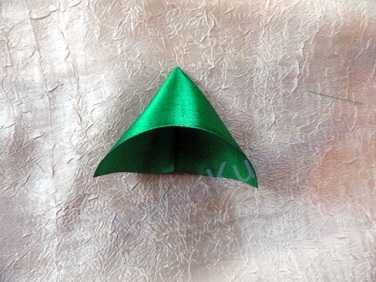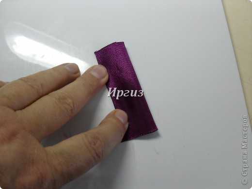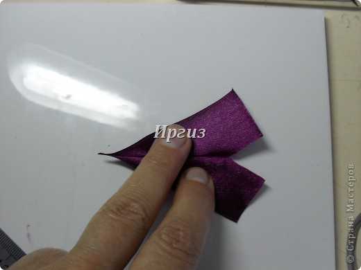 В. Обрезаем ленту -7 см и складываем как на фотографиях (здесь более подробно МК «Мастер класс пышного цветка Канзаши»). Я сначала хотела сложить и показать готовый листочек, потом решила сделать это поэтапно, поэтому ленточка измята …