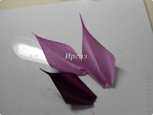 Далее складываем лепесточек пополам и проводим огоньком зажигалки по складке, но не усердствуем, нам нужно сделать прожилку, а не расплавить ленточку, немного приминаем ее пальчиками, чтобы складочка получилась четко прорисованной