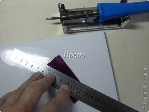 Нагреваем на газовой или электрической плите нож (свеча в данном случае не подойдет, так как она закоптит нож, в результате чего листик будет испорчен). Возьмите на пробу кусочек атласной ленты. Проверяйте на ней температуру ножа. Так чтобы он не был сильно горячим, иначе он станет прожигать ткань, и сильно холодным для того, чтобы оставлять на листочке хорошие следы в виде прожилок.