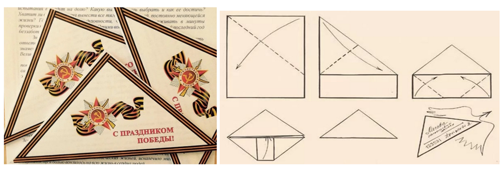 Согните деталь по диагонали, положите ее так, чтобы получился треугольник. Верхнюю часть треугольника согните вниз, как показано на рисунке. Теперь поделите основание будущего конверта на три части и загните сначала один угол на треть, а затем и второй. Уголок, который остался свободным, отогните назад. Хорошенько прогладьте все сгибы. Уголок, который мы отогнули, расправьте, получится кармашек. Теперь загните верхнюю часть вниз, и вставьте в наш кармашек.