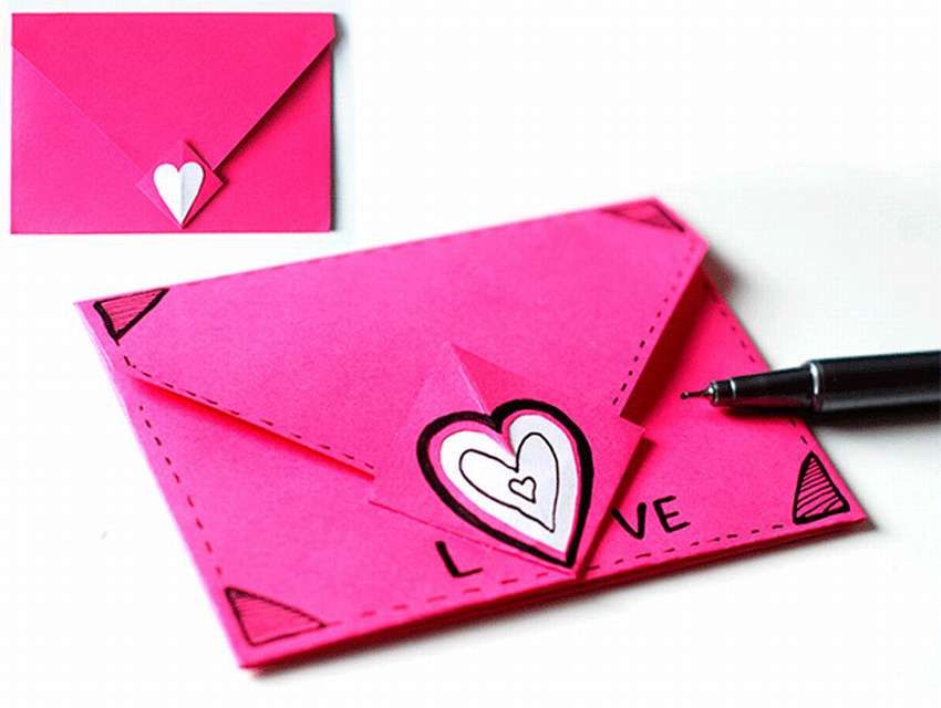 Вырежьте из любой бумаги сердце. Согните части сердца так, как показано на фото. Сложите получившуюся деталь пополам. Возьмите клей и скрепите. Получился отличный конверт, например, для валентинок и признаний.