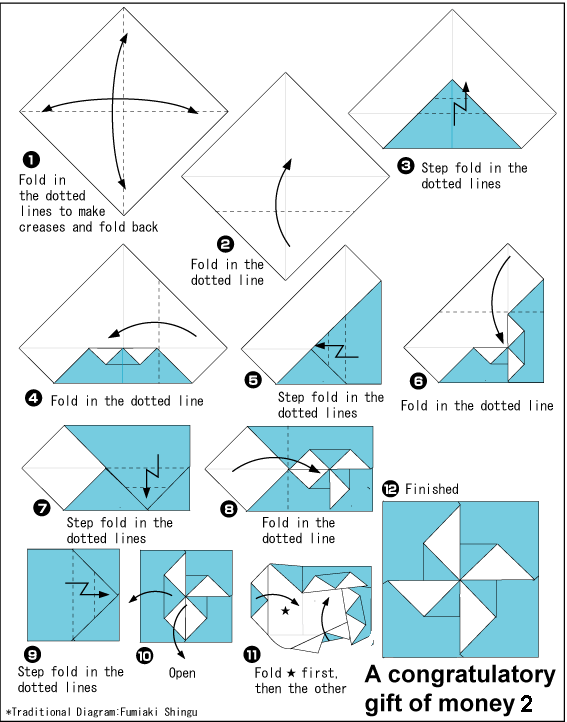 Шаг 3: Сворачиваем купюру пополам, закрываем конверт и завязываем атласную ленту крест-накрест.Закрываем конверт заводя каждый «лепесток» за предыдущий.