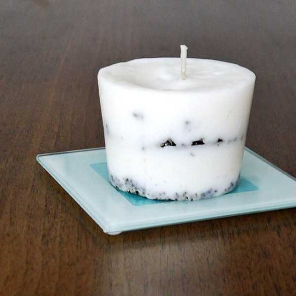 Например, можно для разнообразия добавить в воск несколько кофейных зерен или блесток или вылить свечи слоями, предварительно давая застыть каждому слою. А можно добавить несколько сушеных ягод или фруктов в саму свечу, когда воск еще не застыл.