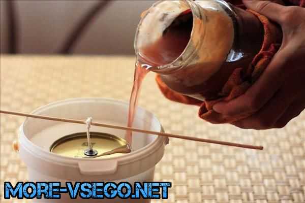 После этого нужно залить расплавленный воск в подготовленные формы. Лить нужно не спеша, чтобы воск не пролился, при этом нужно следить, чтобы фитиль был надежно закреплен в одном положении.