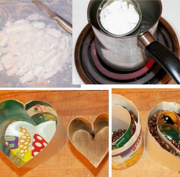 Сначала измельчи свечи ножом, извлеки из них фитили, затем растопи куски парафина на водяной бане.Когда парафин расплавится, не снимая кастрюльку с водяной бани, добавь туда кофейные зерна, а через 10 минут убери их и положи на дно формы, заполнив ее почти наполовину.