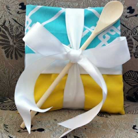 Так дарят фартуки настоящие мужья. Несложно догадаться, что фартук сложен в 4 раза, как и любая другая вещь при упаковке. Но так тоже можно выйти из положения, украсив презент небольшой деревянной ложкой.