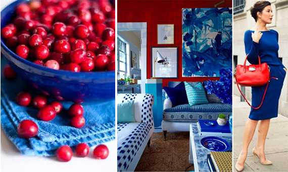 Можно сказать, что красный + синий борются друг с другом: они одинакового тона, одинаковой яркости, но противоположны в свойствах — вызывают противоречивые чувства. «Помирить» их может белый цвет. Сочетание данной пары с белым гораздо более гармонично, чем композиция без последнего. В активность обоих оттенков, через нейтральный светлый тон, приходит мир, вещи или интерьер таких тонов будут, успокаивать или бодрить, в зависимости от вашего настроения.