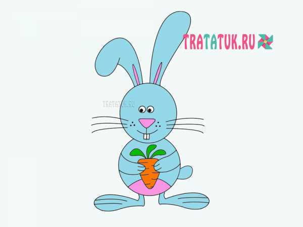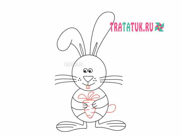 И завершающий этап – зайчику можно вручить морковку. Также не обойтись без хвостика и зубов, которые, в принципе, можно было нарисовать еще на этапе создания мордочки. Рисунок зайца полностью завершен.
