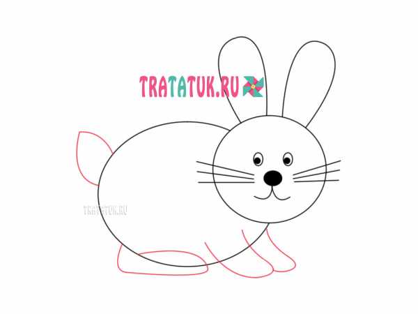 Продолжаем наполнять рисунок деталями. Рисуем «пипку» носа, хвост и намечаем двумя овалами стопы задних лап.
