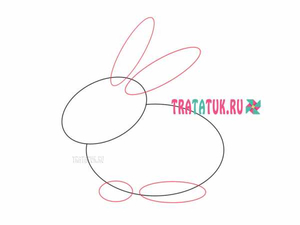Теперь намечаем уши и «щеки» зайца. Также двумя линиями наметим расположение передних лапок.