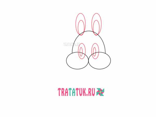Сотрите линию в верхнем круге. Дорисуйте уши. Они могут быть любой длины. Форма также по желанию, главное – продолговатость.