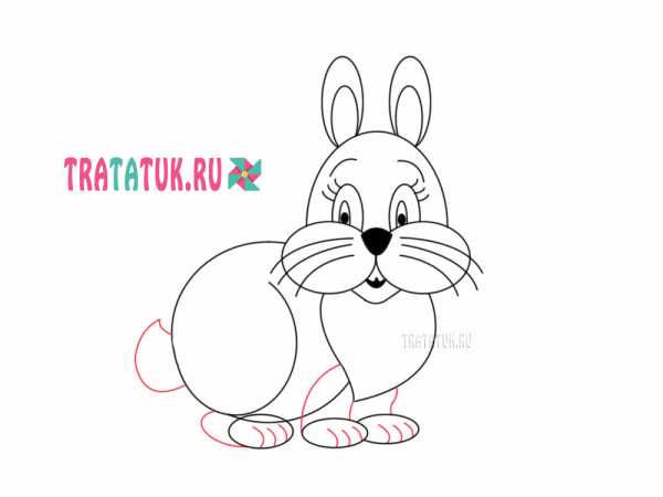 Ну вот, самый сложный этап мы выполнили. Если он у вас получился, все отлично!!!! Теперь рисуем передние лапки, язычок и «оживляем» зайчика, добавляя ему шерсти на мордочке, животике и хвостике.
